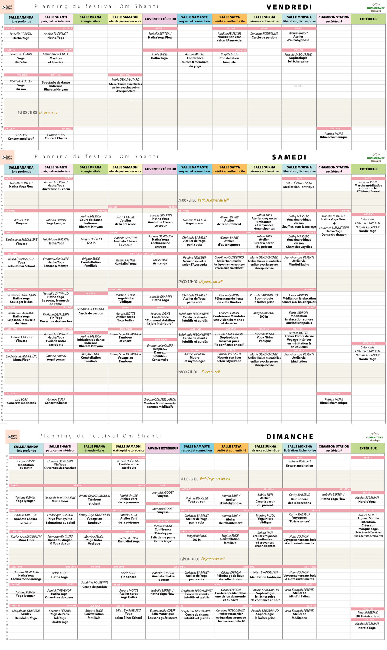 Onze espaces, en salle ou en extérieur, accueillent cours de yoga, conférences, ateliers, chants, danses et concerts, de 14h00 à 22h30 le vendredi, de 6h du matin à 22h30 le samedi, et de 6h00 à 18h00 le dimanche.